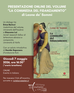 PRESENTAZIONE ONLINE “LA COMMEDIA DEL FIDANZAMENTO” DI LEONE DE’ SOMMI (GIUNTINA 2025) con Erica Baricci e Giacomo Loi Giovedì 7 maggio 2026, ore 16:30 (orario israeliano) Evento in italiano «Venite, ascoltate la commedia del fidanzamento in tutto il suo splendore, Una lode solleva e fama dà e gloria al suo autore. […] Tra i fraudolenti […]